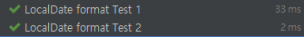 @Test @DisplayName("LocalDate format Test 1") void localDateTest1(){ LocalDate localDate = LocalDate.of(2022,06,06); DateTimeFormatter yyyyMMdd = DateTimeFormatter.ofPattern("yyyyMMdd"); assertEquals("20220606",localDate.format(yyyyMMdd)); } @Test @DisplayName("LocalDate format Test 2") void localDateTest2(){ LocalDateTime localDateTime = LocalDateTime.of(2022,06,06, 10,10,10); DateTimeFormatter yyyyMMddHHmmss = DateTimeFormatter.ofPattern("yyyyMMddHHmmss"); assertEquals("20220606101010",localDateTime.format(yyyyMMddHHmmss)); }